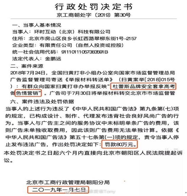 2018年7月24日,环时互动因为杜蕾斯品牌做高考软色情营销,被罚款80万元。
